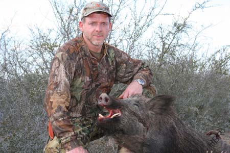 Paul Bruning with big hairy curly tailed hog